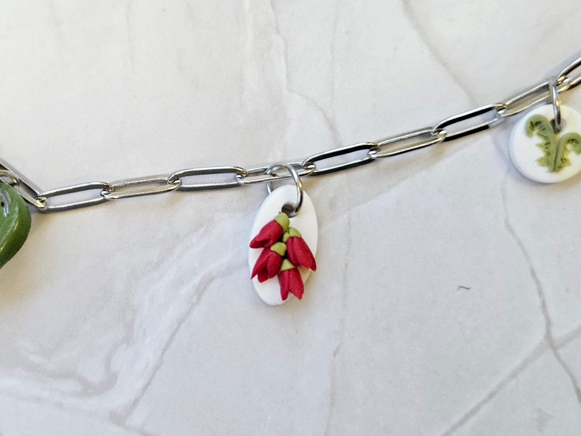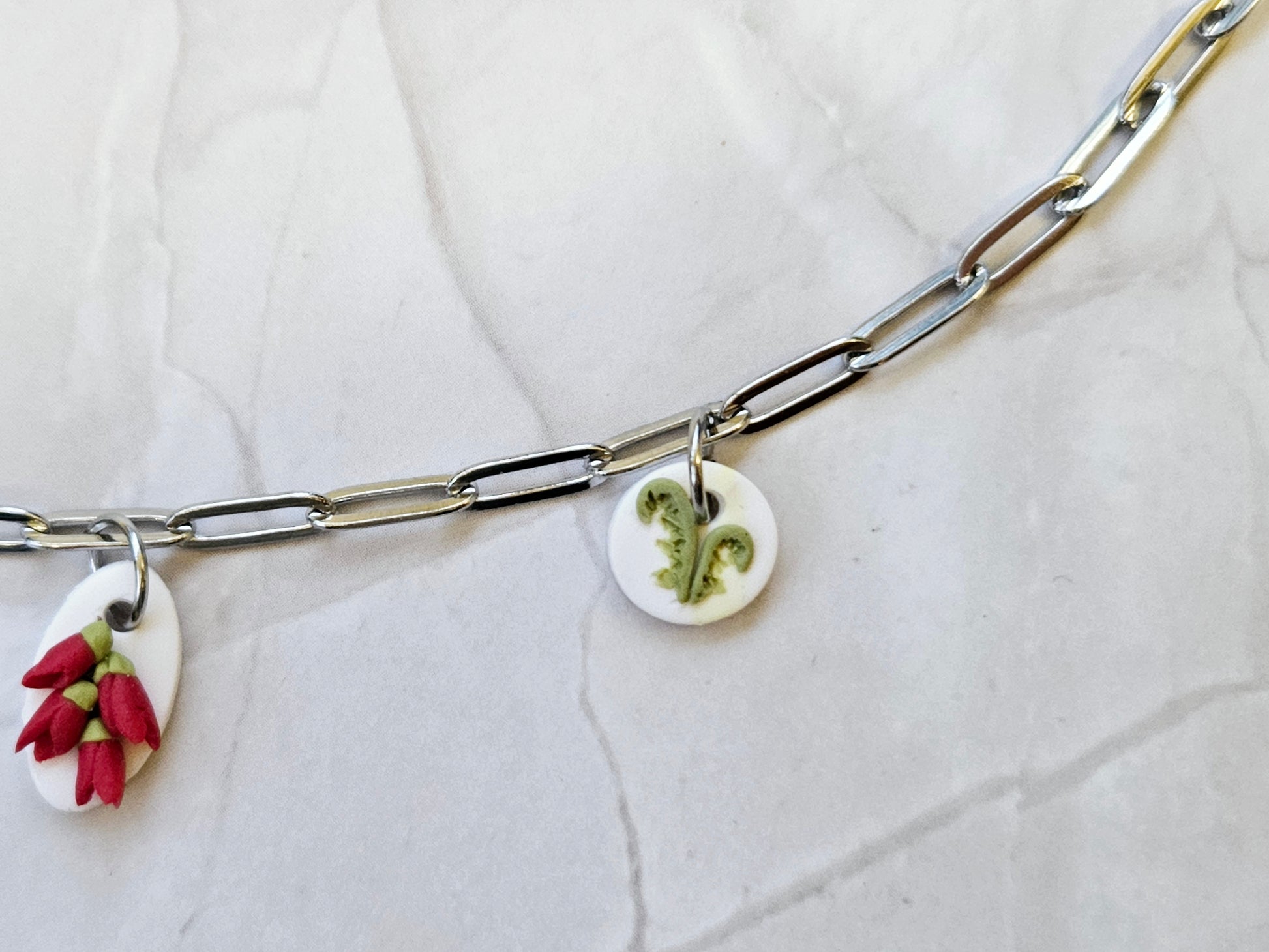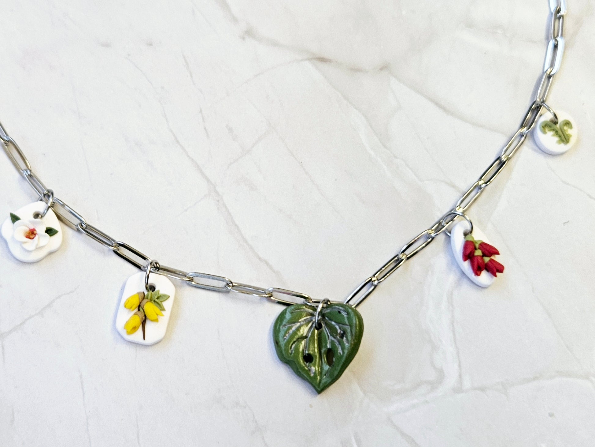 Each necklace is a tiny celebration of craftsmanship, featuring a hand-sculpted polymer clay charm that’s as unique as you are. Whether it’s a miniature Kakabeak bloom, a bakery-inspired treat, or a native flora motif, every detail is lovingly shaped, painted, and sealed for durability and delight.
