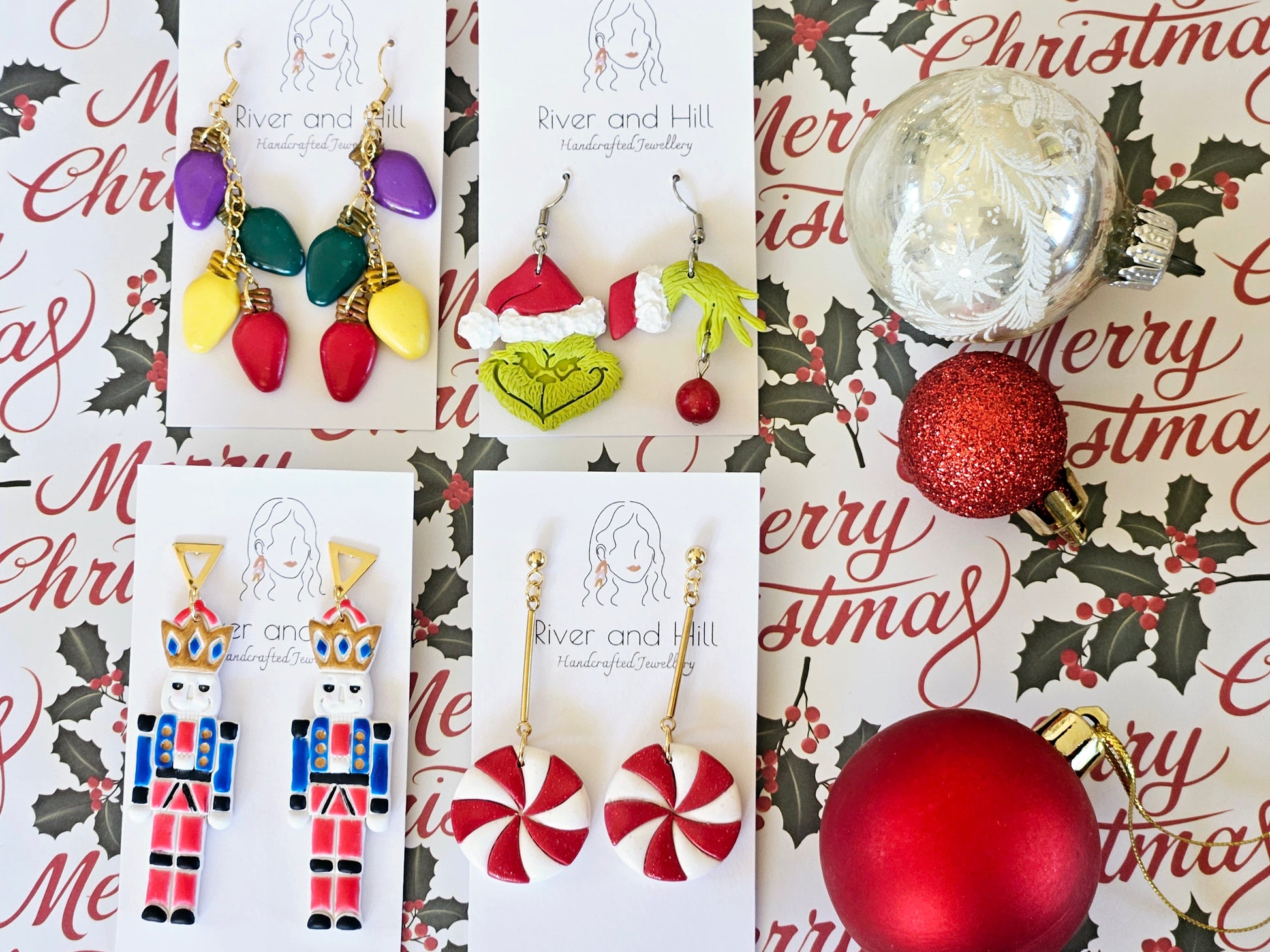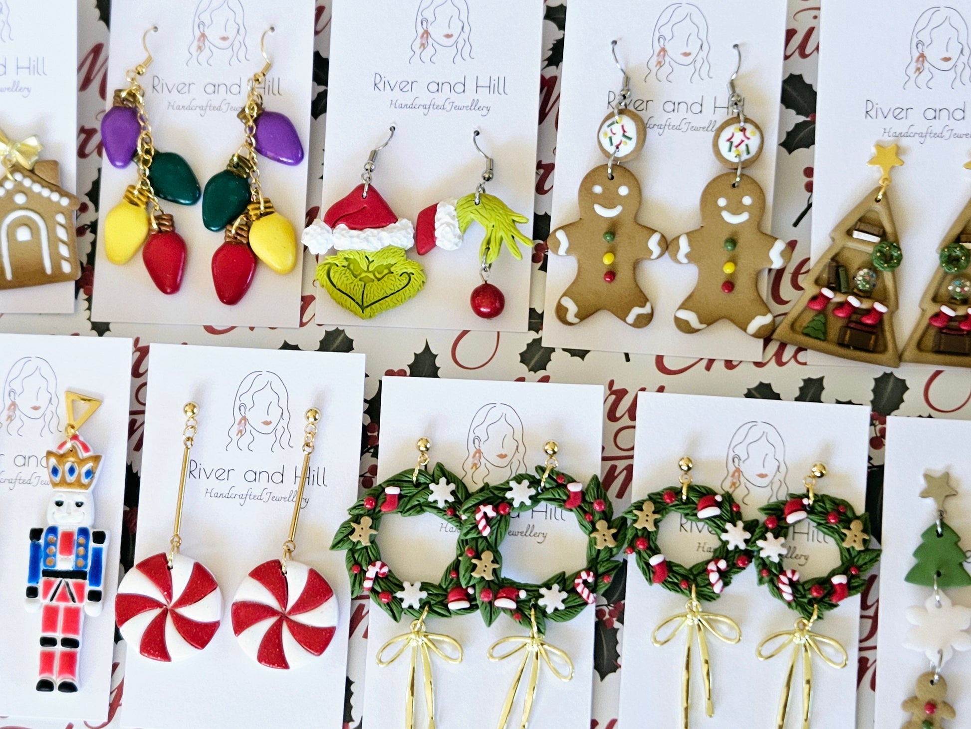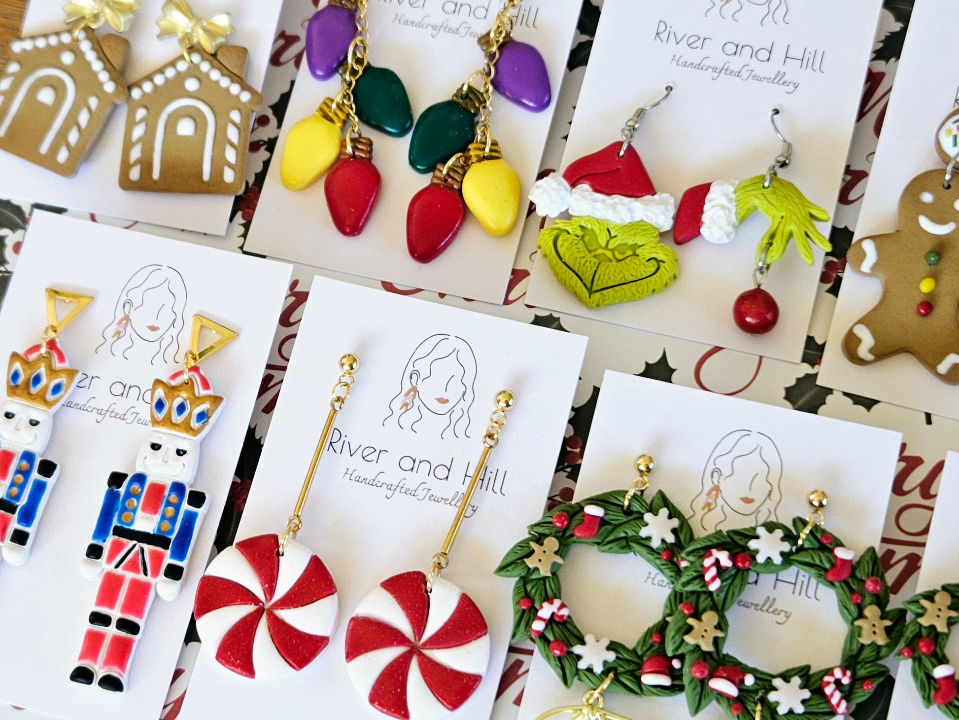 Our Christmas Collection has a range of festive earrings, all handmade in New Zealand using polymer clay. From fun gingerbread houses to a traditional wreath hoops there's something for everyone.