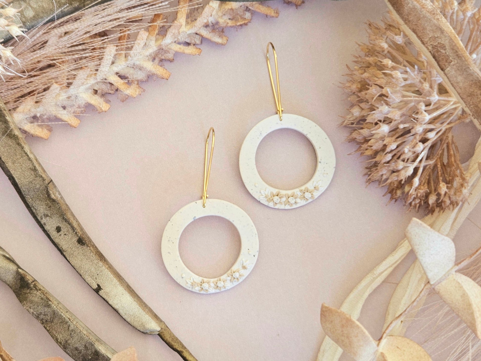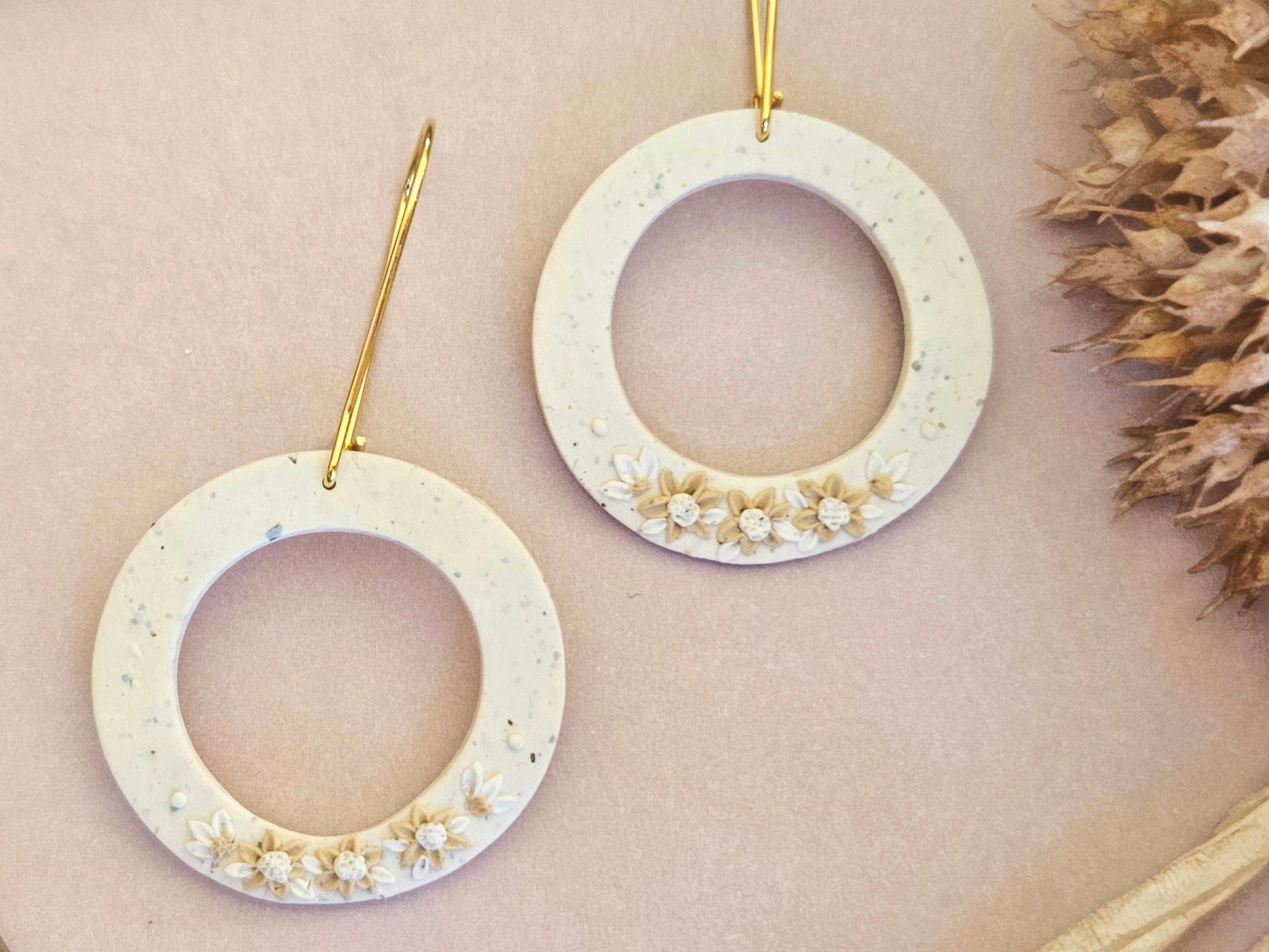 All earrings in our charming Flecked Floral Collection feature specks of black sand mixed within the clay. Available in neutral beige designs, or with pastel shades of purple and green. The earring findings are gold coated stainless steel, perfect for those with sensitive ears.