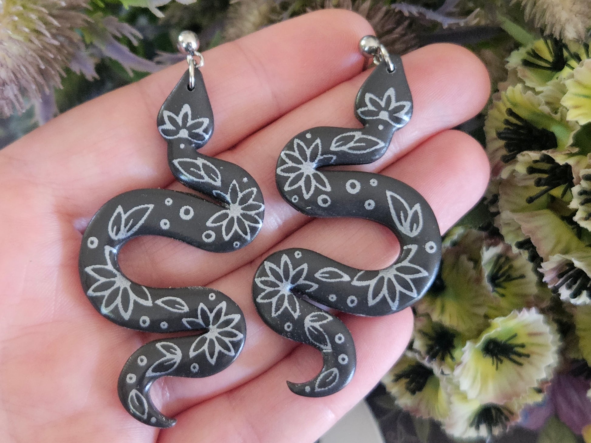 Grey and Silver Floral Snake Earrings Large