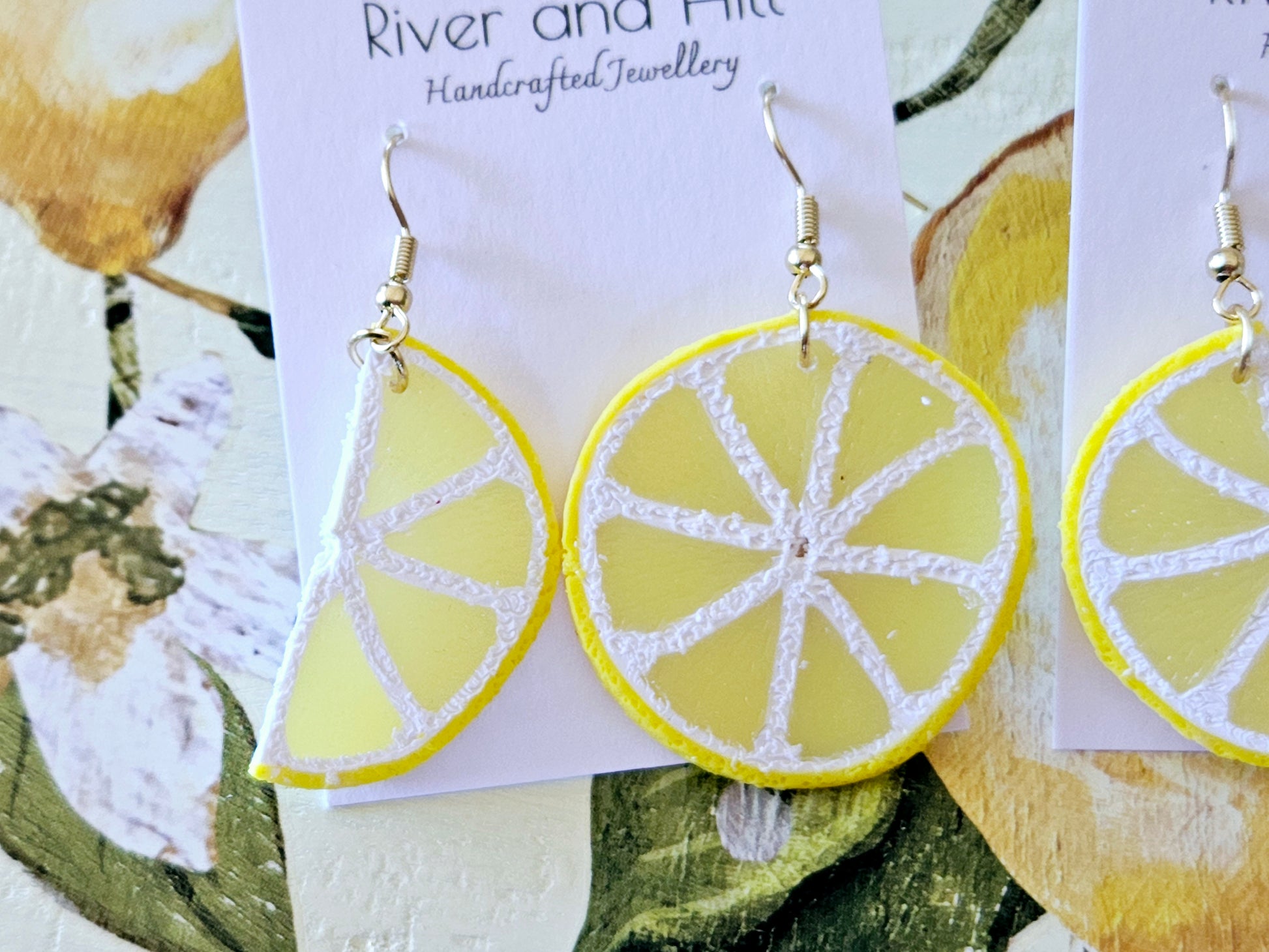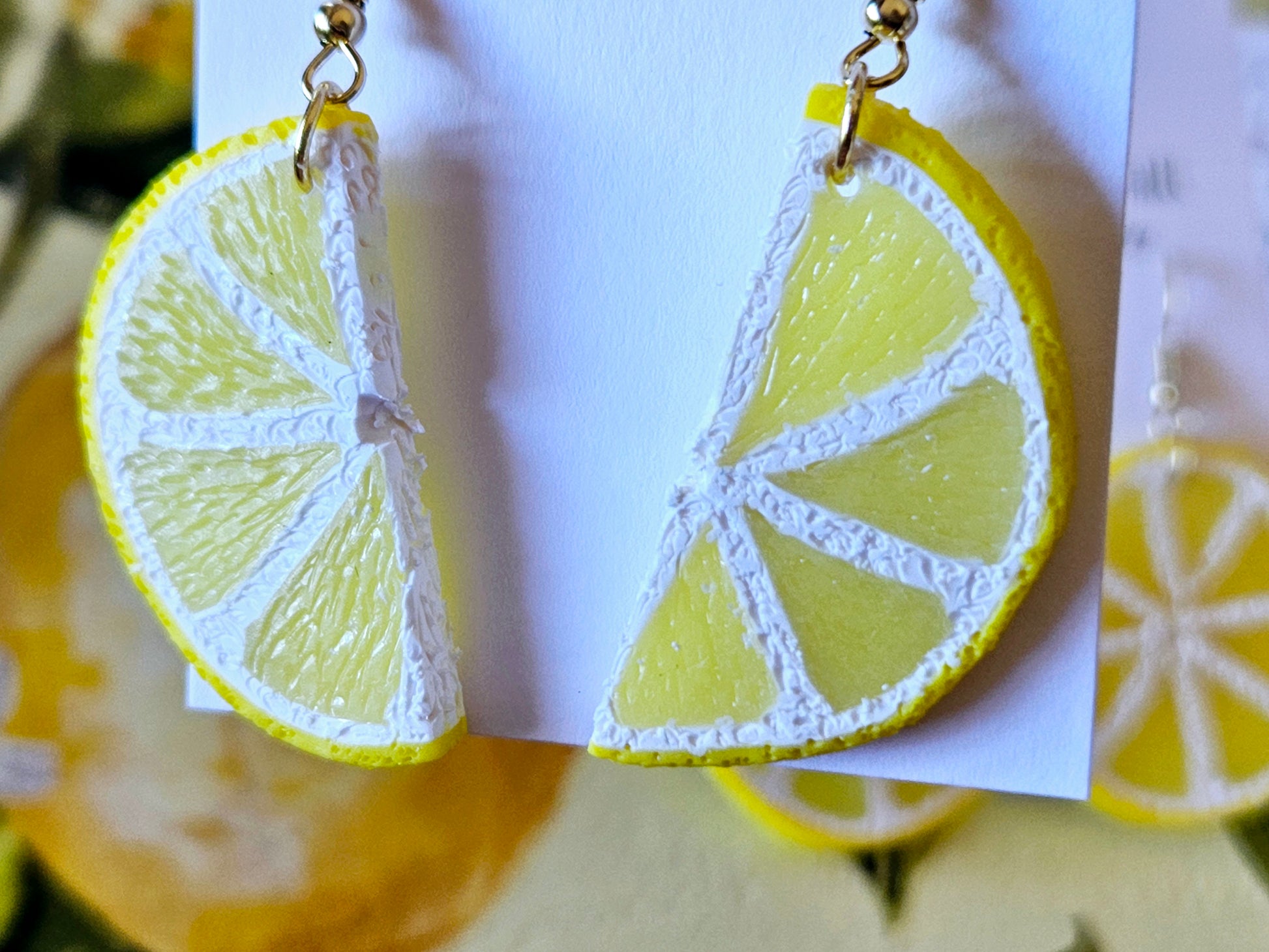 These lemon earrings will add a little bit of fun and colour to your ears! The lemons are handmade with polymer clay. Every little detail was individually made with a needle point, and the slices have a thin layer of gloss applied to give them a juicy shine. Every little detail was individually made with a needle point. Handmade in New Zealand.