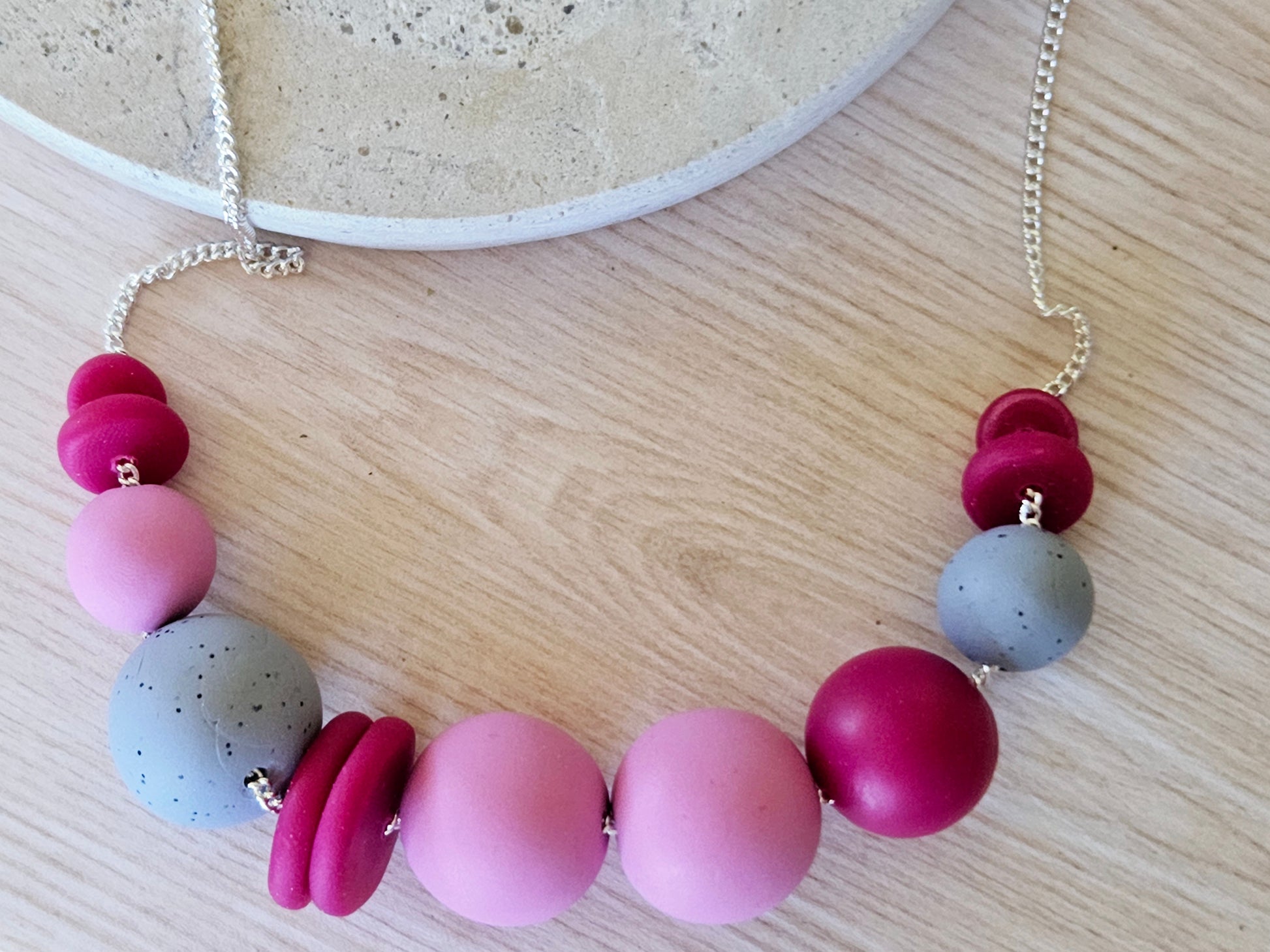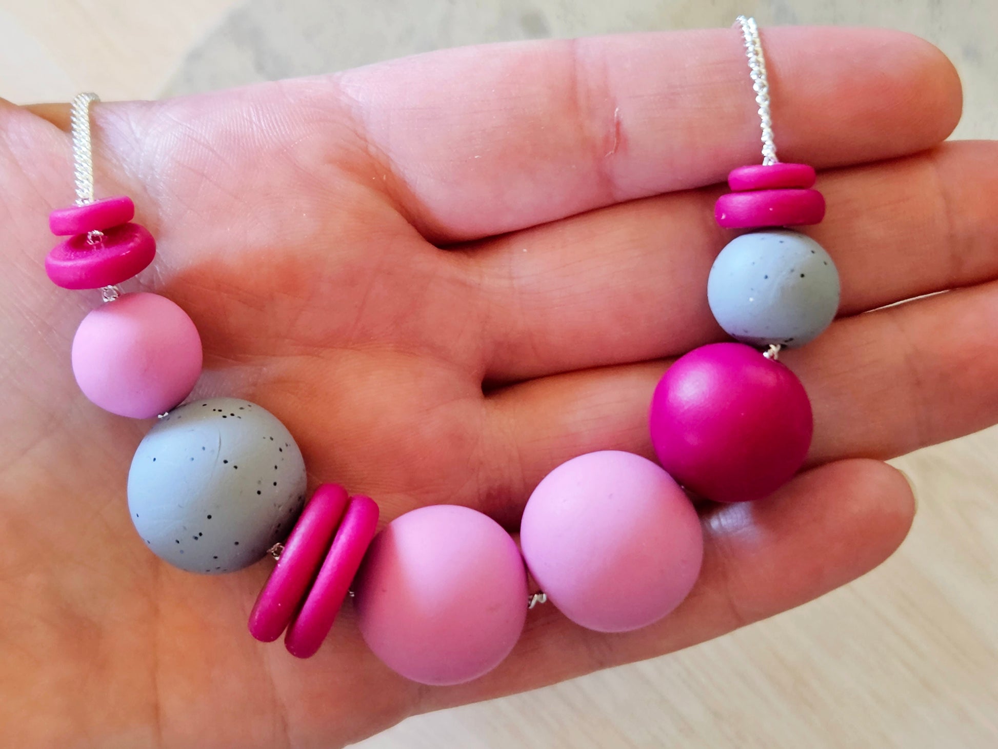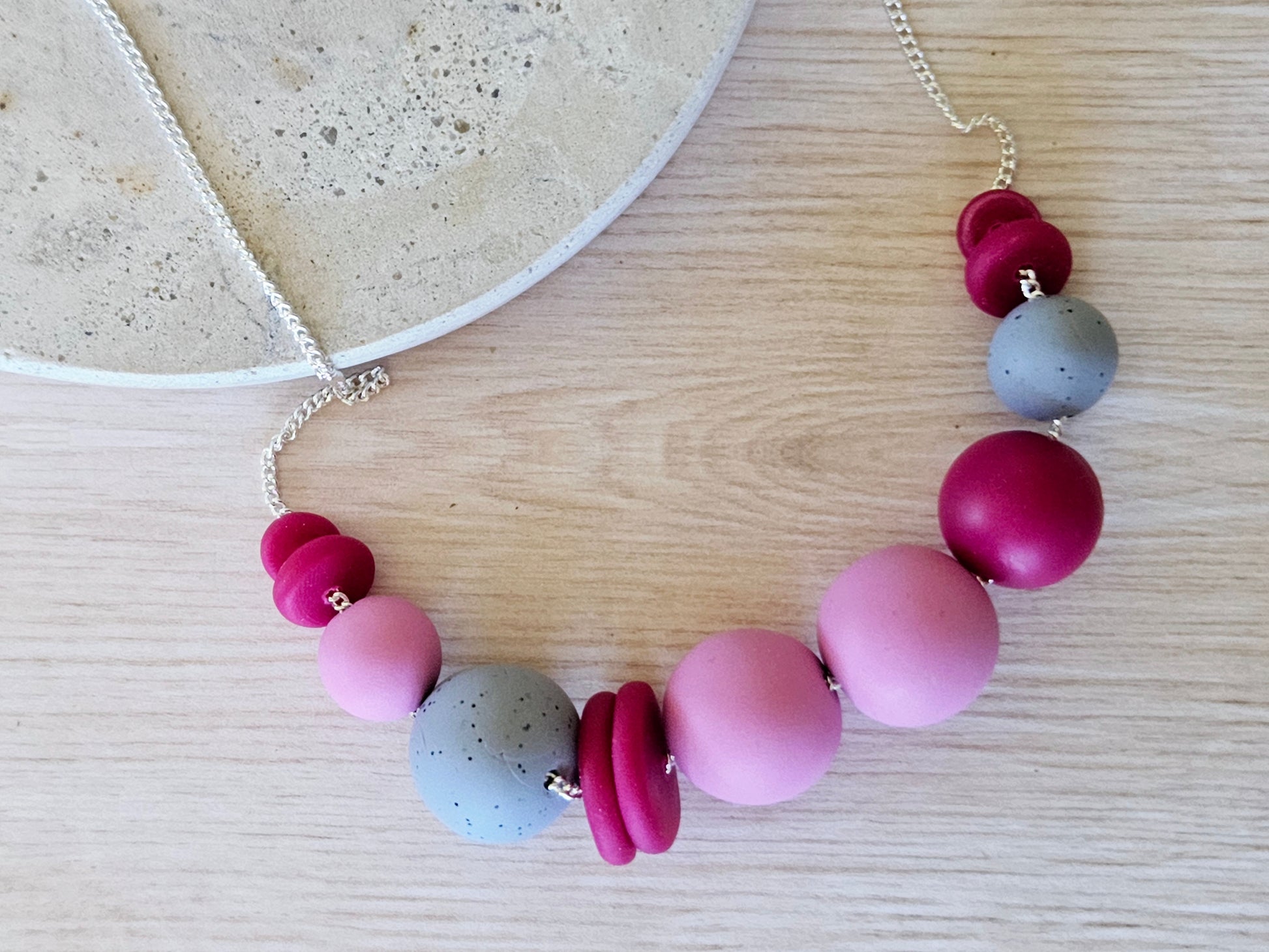Enhance your outfits with this stunning hand-rolled polymer clay statement necklace. Each bead is handmade individually, making each necklace unique to you.