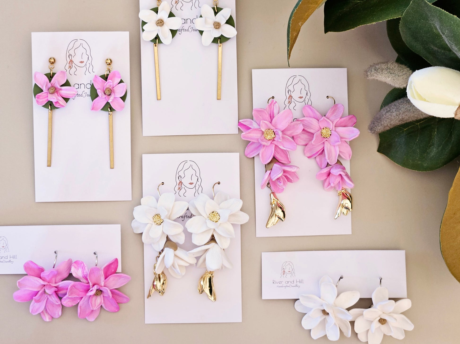 Delicately sculpted and full of grace, these handmade magnolia flower earrings celebrate the quiet strength and timeless beauty of nature. Each petal is shaped by hand, capturing the soft curves and subtle ivory or pink hues that make magnolias a symbol of resilience and femininity.