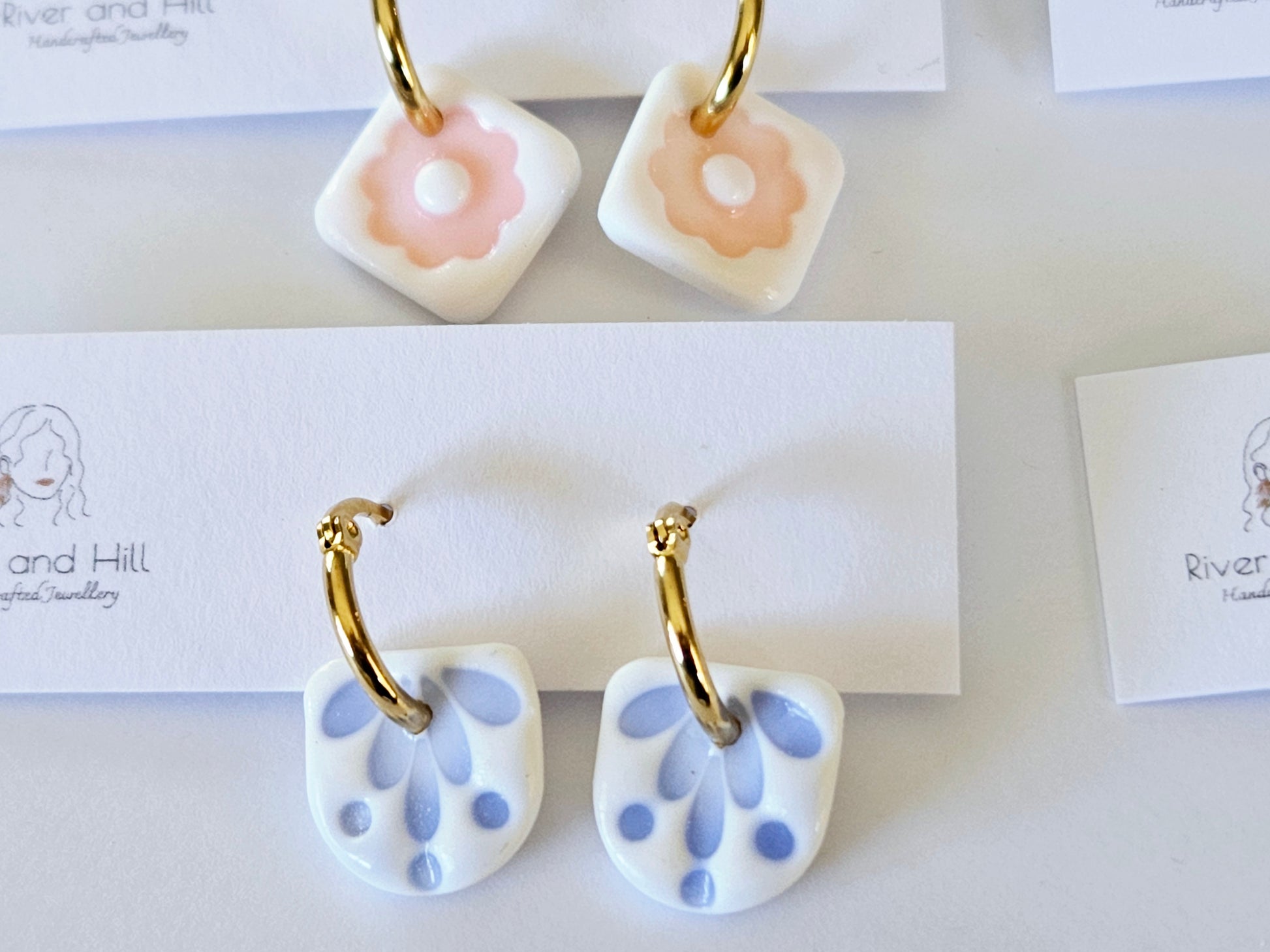 These handmade polymer clay earrings are crafted to mimic the soft and timeless beauty of porcelain without the fragility. Each pair is shaped, sanded, and glazed individually by hand, capturing the quiet luxury of ceramic artistry with the lightweight comfort of clay.