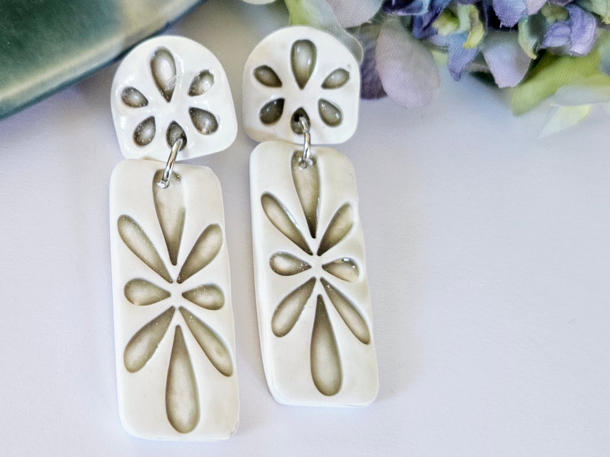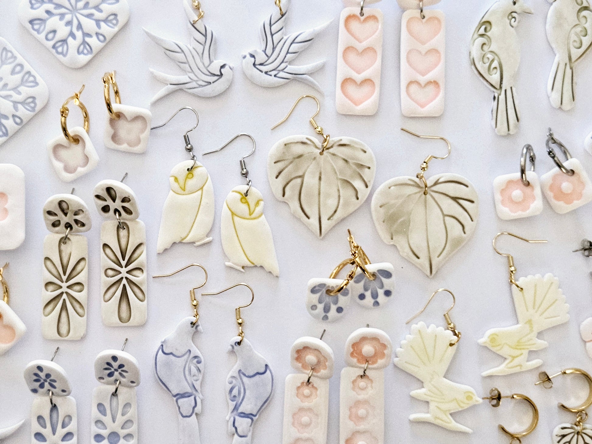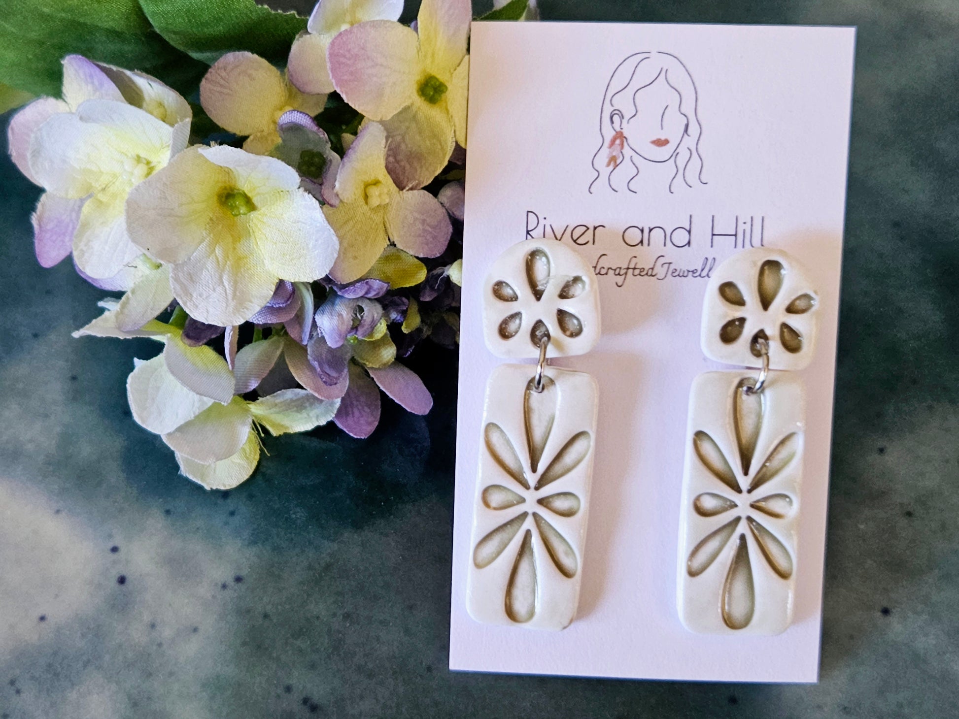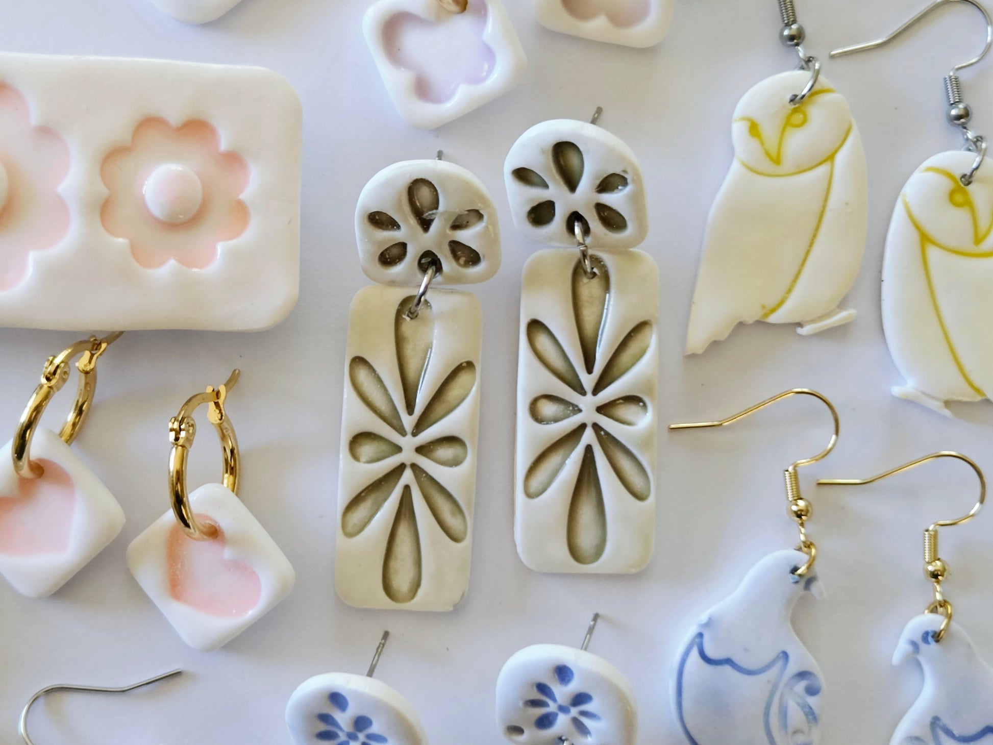 These handmade polymer clay earrings are crafted to mimic the soft and timeless beauty of porcelain without the fragility. Each pair is shaped, sanded, and glazed individually by hand, capturing the quiet luxury of ceramic artistry with the lightweight comfort of clay.