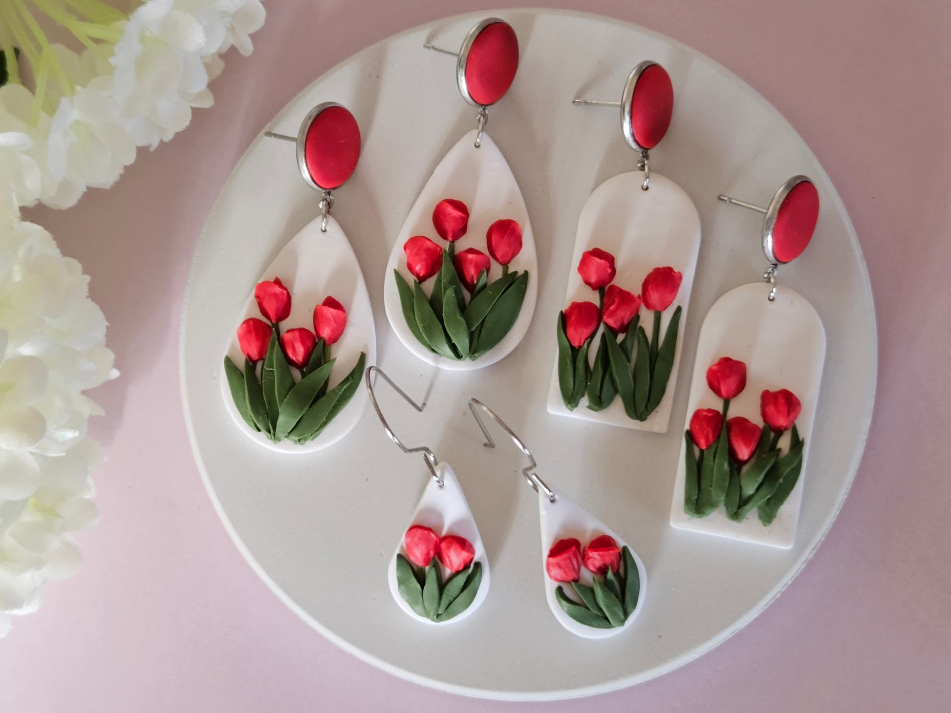 Add a touch of spring to your look with these beautiful polymer clay tulip earrings. These earrings are handmade with polymer clay and feature realistic details and vibrant colors. The tulips are attached to stainless steel earring posts and measure about 5.5 cm in length. They are lightweight and comfortable to wear, and make a perfect gift for yourself or someone special. Whether you want to brighten up your outfit or express your love for nature, these polymer clay tulip earrings are a lovely choice.