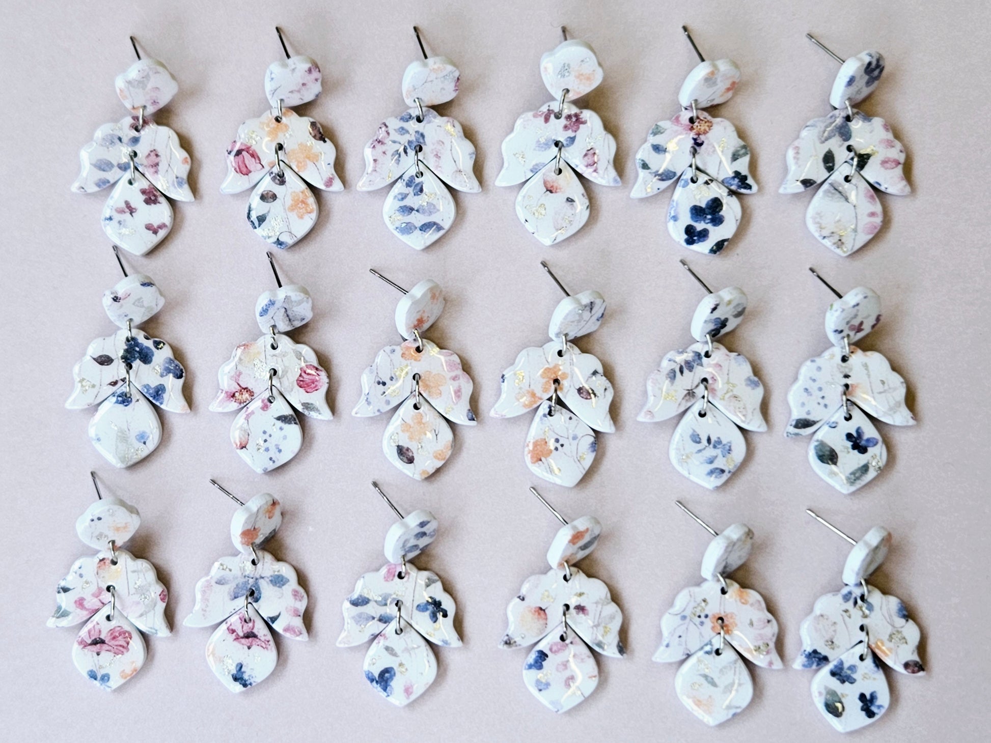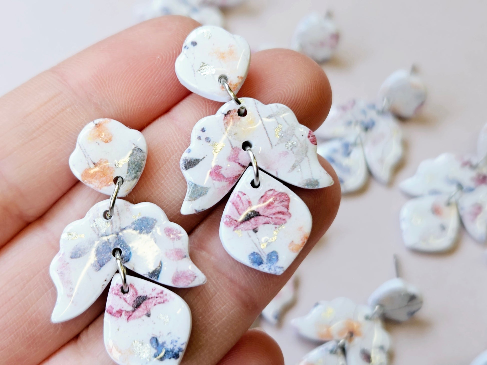 Our watercolour floral print earrings are simply stunning. They are handmade with clay and a floral print transfer sheet before being finnished with a shiny coat of resin.